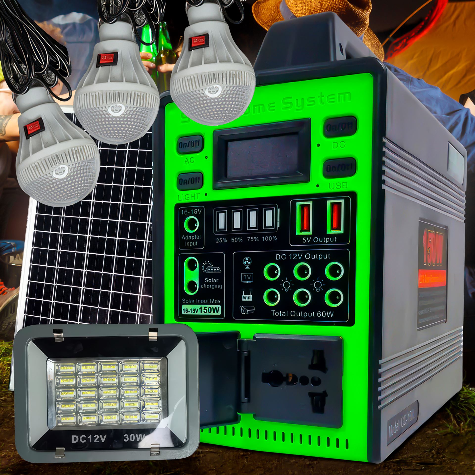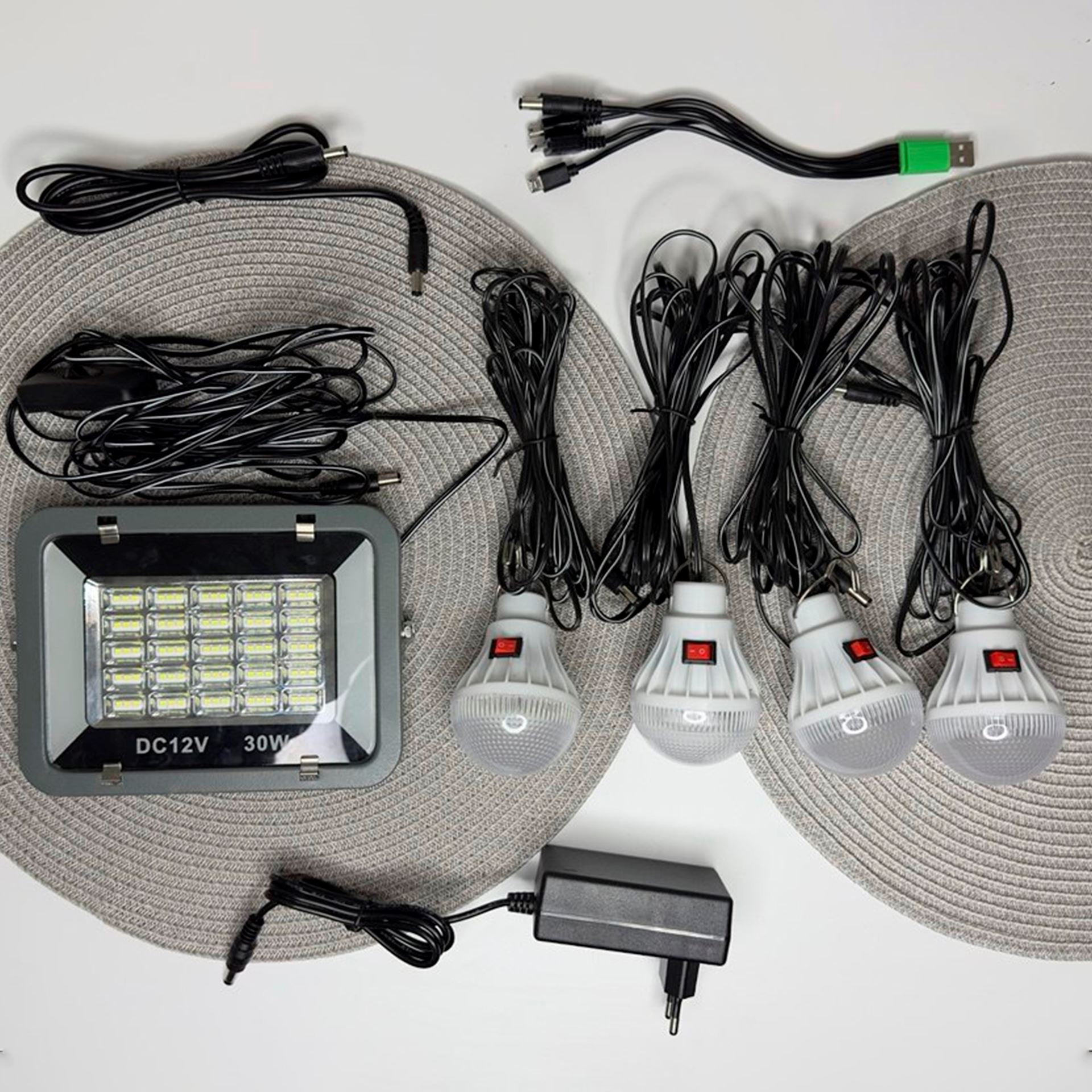 У комплекті є все для освітлення: потужна сонячна панель, 4 LED лампи та прожектор. Просто підключіть акумулятор і користуйтесь.